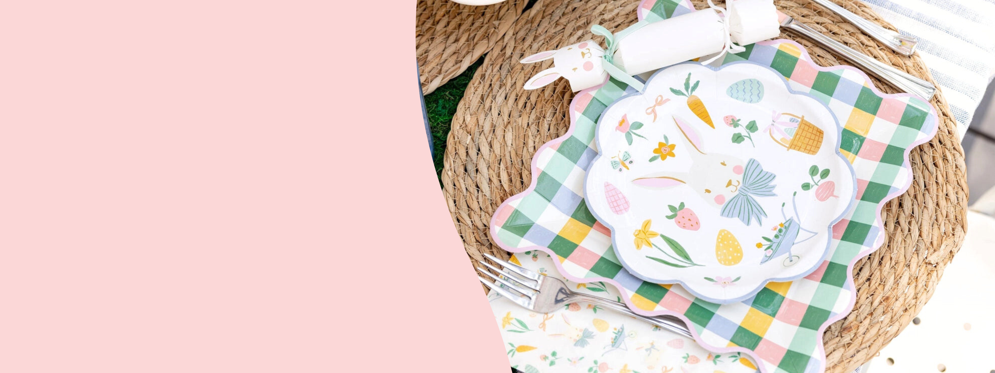 Sweet tableware and Easter party supplies for hosting family dinner, celebrating in the classroom, and filling Easter baskets.
