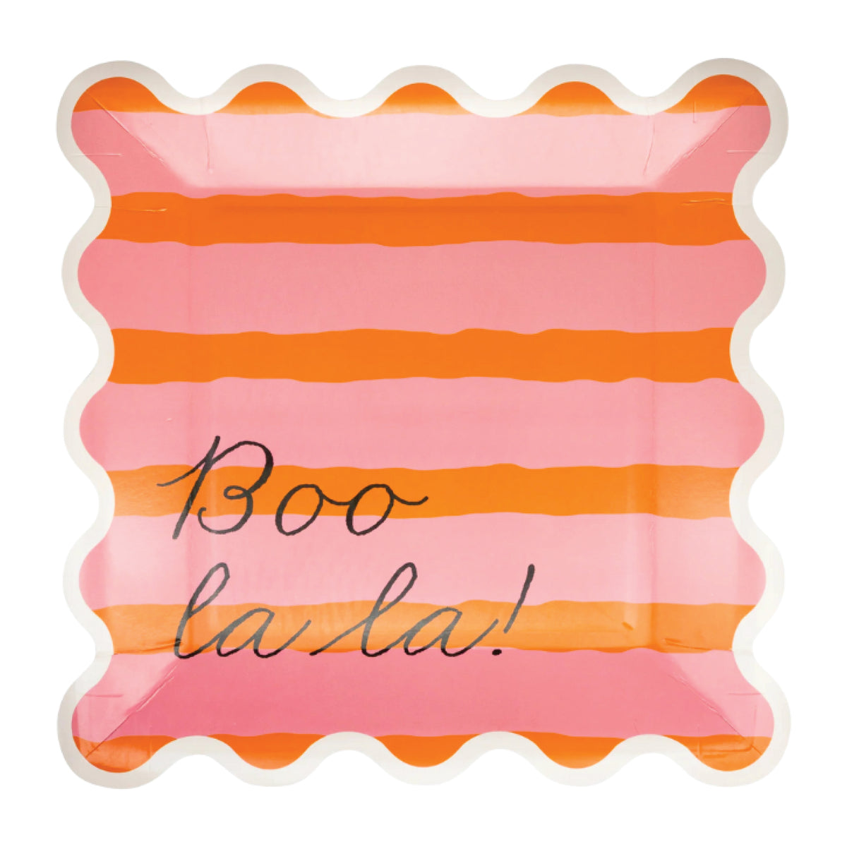 Serve up spooky sweetness with a splash of Parisian flair using these Pink & Orange Striped Halloween Lunch Plates. Featuring bold pink and orange stripes, cream elegant scalloped edges, and a flirty “Boo La La!” black script across the front, these girly Halloween plates add just the right amount of je ne sais quoi to your Halloween party table décor.