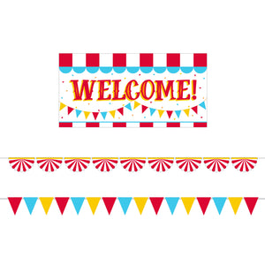 Welcome your family and friends to the Greatest Show on Earth with these Carnival Welcome Sign & Banners Set. This set includes a bright-colored WELCOME sign, red and white bunting banner, and a red, blue, and yellow pennant banner. Hang these signs to create a warm welcome to your guests. These signs are perfect decorations for a circus, county fair, or carnival party.