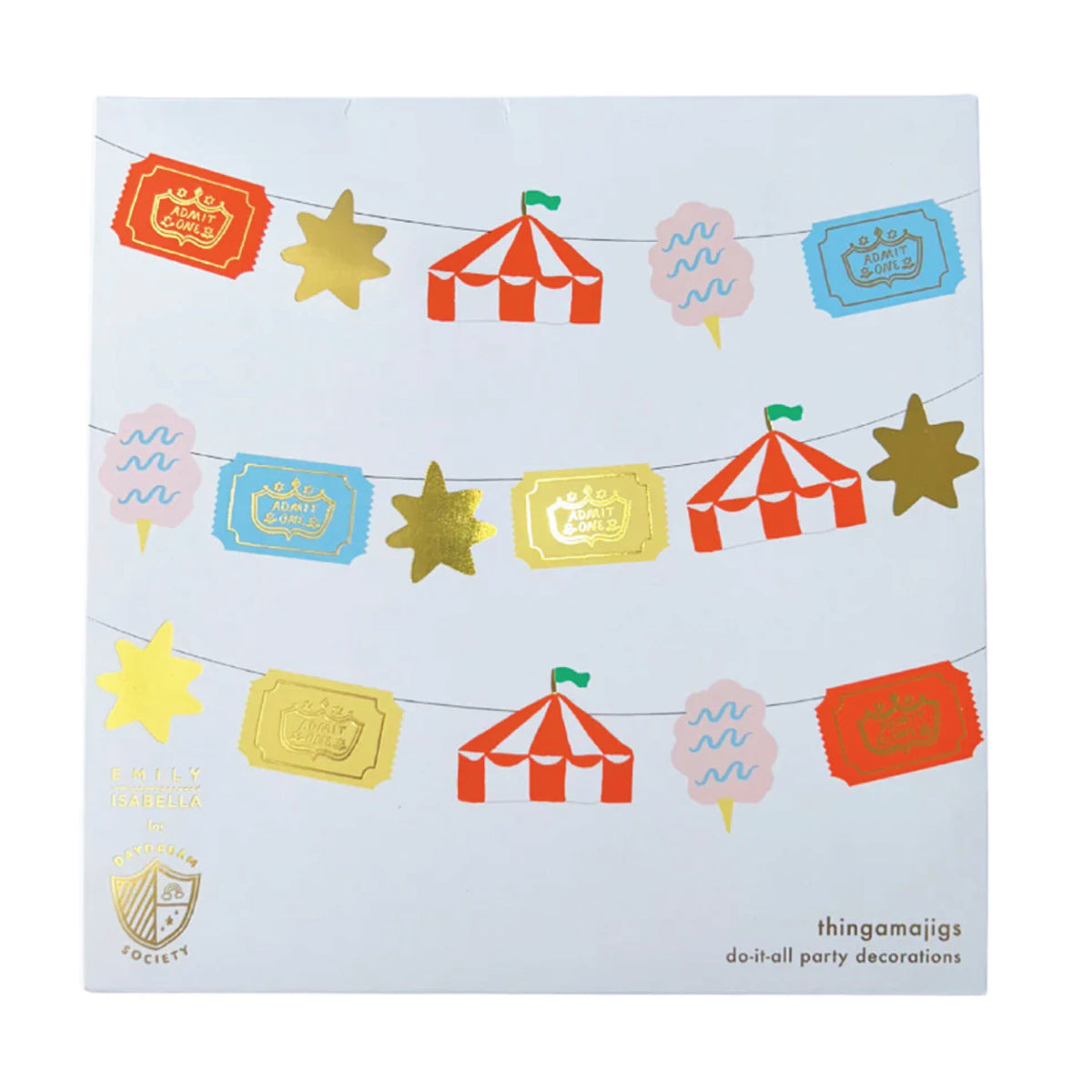 Let the festivities soar with our DIY County Fair Party Garland, where crafting carnival magic is a breeze! This DIY garland kit features sixteen fair-themed paper cutouts, including circus tents, cotton candy, shimmering gold stars, and "admit one" tickets. With twenty feet of string included, assembling this garland is a breeze—string them together and drape the garland across mantles or walls. Or ditch the craft and have the cutouts in a balloon garland, create a vibrant photo backdrop, or stick them to walls for a spectacular touch that brings the magic of the fair into your home. So let the creativity unfold and use these county fair decorations for a circus-themed extravaganza or a playful carnival birthday bash.