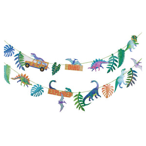 Invite their favorite dinosaurs to the Jurassic party with these Dinosaur Explorer Party Garlands. These garlands are pre-strung with brightly colored jungle foliage and two cardstock signs that read "Dino" and "Explorer." T-rex, pterodactyl, brachiosaurus, stegosaurus, and triceratops dinosaurs are also attached to the green strings. Hang these dinosaur decorations on the wall or across the table at your little one's dinosaur birthday party!