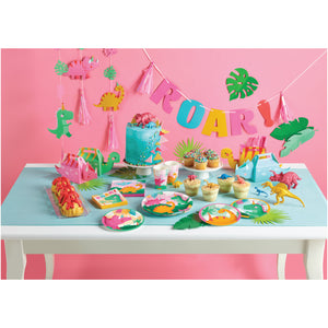 Hydrate all the little prehistoric creatures during your party with Girl Dinosaur Paper Cups! These cute paper cups feature colorful dinosaurs in party hats, plant life, and clouds on a pink and green background. Place a stack of these cups on the tables so guests can grab their favorite drink. The little dino fans at your child's dinosaur birthday party will love these dino-mite party cups.