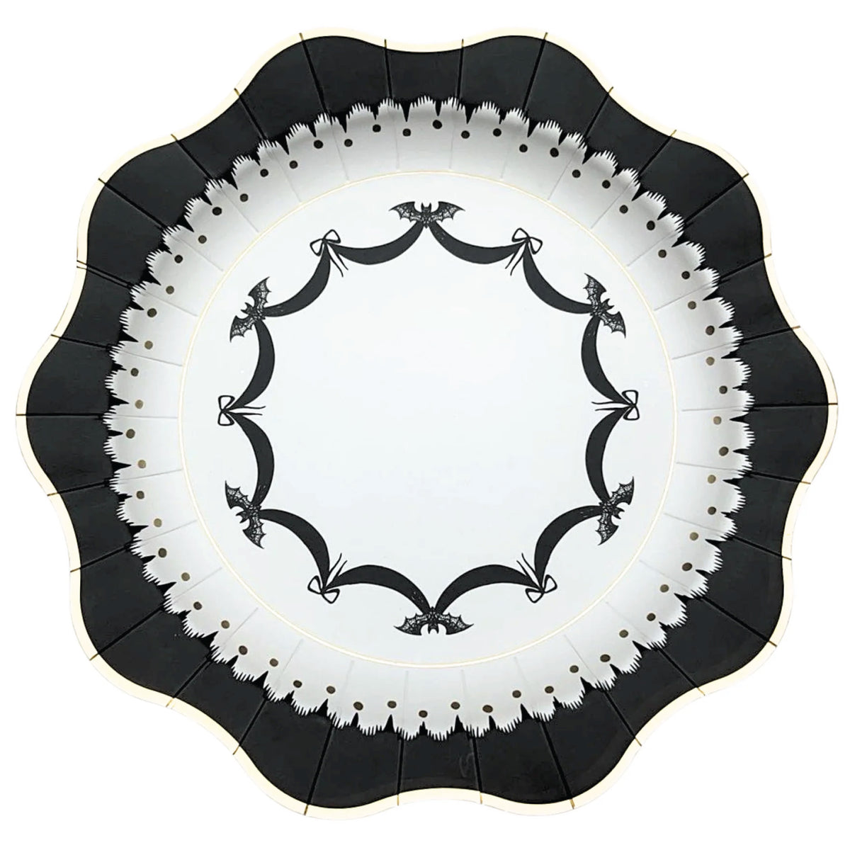 Feast in style at your Halloween party with these Elegant Halloween Dinner Plates! These large paper plates showcase a delicate design of black lace bats, petite black ribbons, black drapes, and scalloped edges with gold foil trim. Perfect for serving up your favorite spooky treats, these disposable plates ensure a stylish meal and effortless clean-up. Ideal for a Halloween bash with your best witches or a spooktacular birthday party, these plates add a touch of eerie elegance to your celebration.