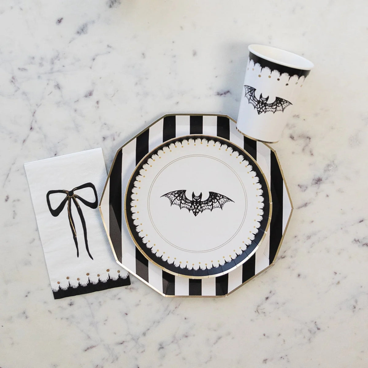 Don't go batty—sip your favorite beverages at your Halloween party with these Elegant Halloween Paper Cups! These paper cups feature a scary chic design with a delicate lacy bat on a white background, framed by a gold foil border along the bottom and an eerie black border along the top. Perfect for sipping hot or cold beverages, these disposable cups make cleanup a breeze. Use these Halloween cups at a spooktacular party for kids or adults, adding elegance to your eerie celebration.