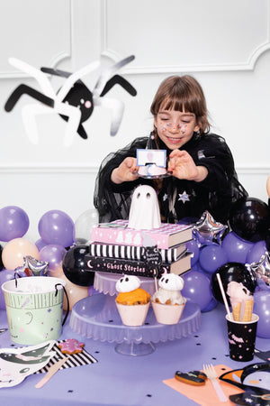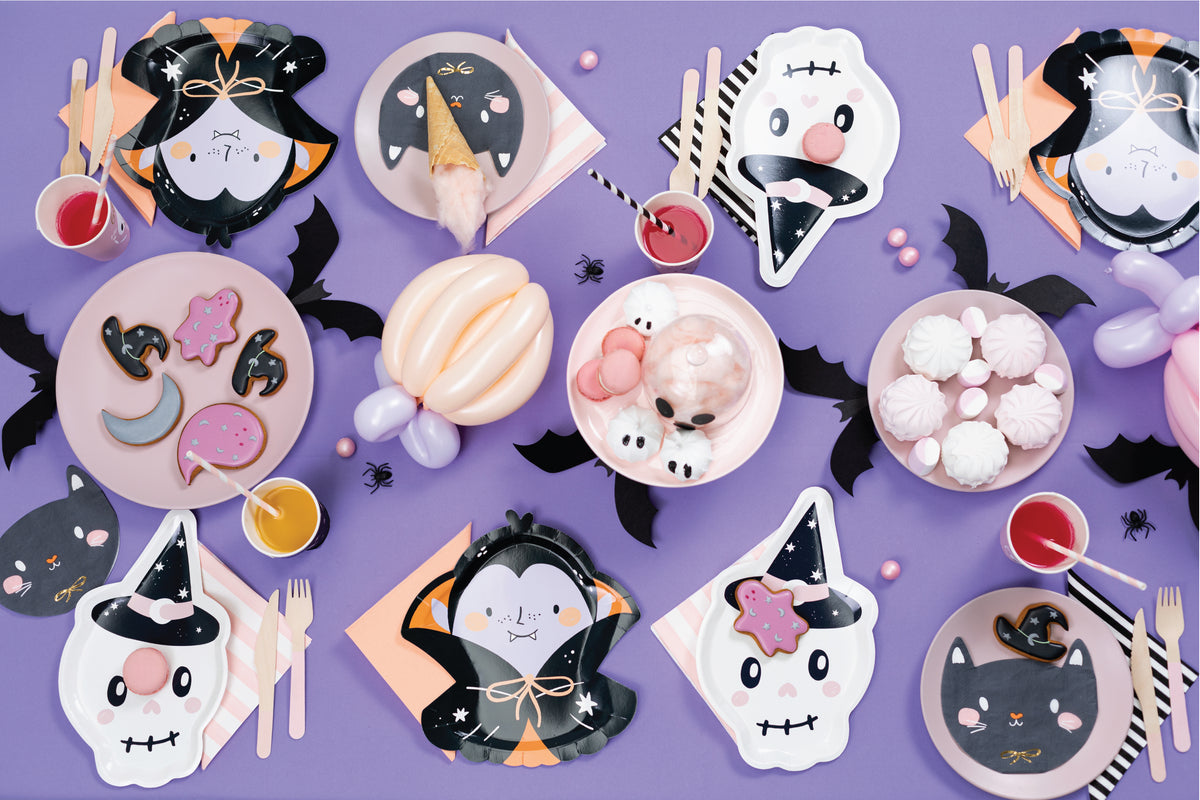 Add a charming yet spooky cute addition to your kid's Halloween party with these Friendly Halloween Witch Skull Lunch Plates! These paper plates feature a playful design of a skull with a friendly smile wearing a witch hat. Use these Halloween plates to serve appetizers, snacks, or other bewitching treats at your Halloween gathering. These plates will surely bring a smile to everyone's face while enjoying their delicious goodies at your child's Halloween birthday or a trick-or-treat Halloween party.