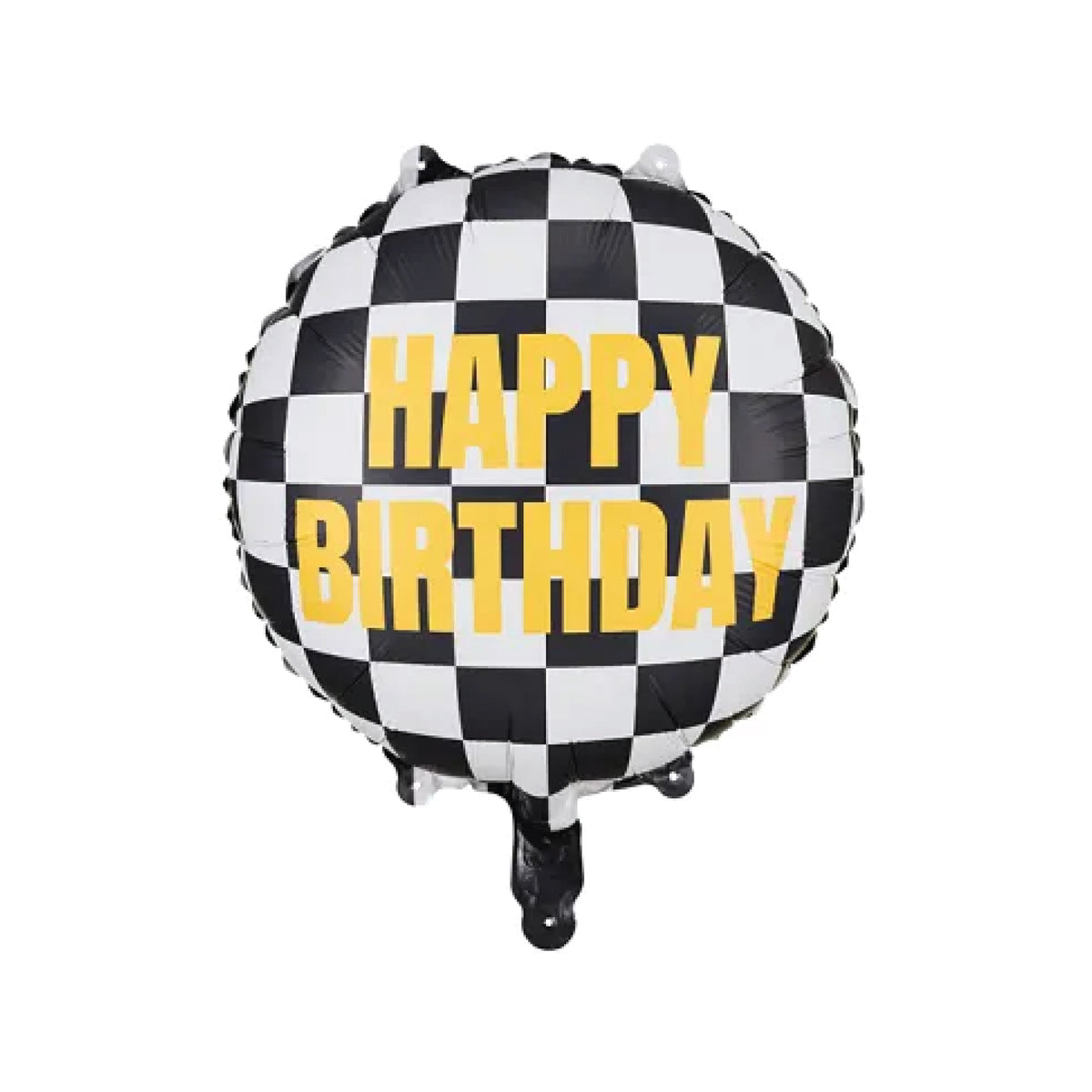 Race into the birthday festivities with this Checkered Flag Happy Birthday Foil Balloon. This round foil balloon is a winning addition to your racing party decorations, featuring a striking black and white checkered pattern with a gold  "Happy Birthday" headline. Fill the balloon with air using the included straw, or use the helium option to create a standout balloon bouquet that will blow everyone away. Whether celebrating a fast one, two fast, or any race car birthday party, this checkered flag balloon will set the pace for a high-speed adventure!