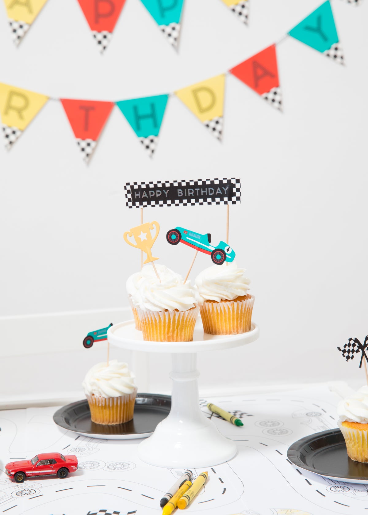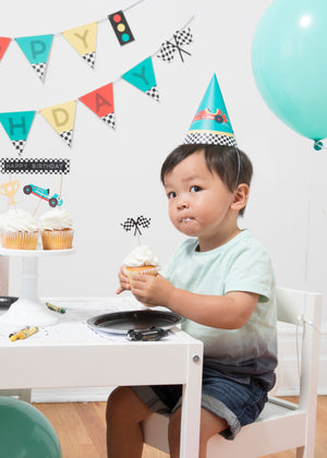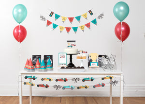 Guests will want to make a pit stop at the dessert table when you use these Vintage Race Car Cupcake Toppers & Wrappers! This cupcake decorating kit includes checkered black and white wrappers and cupcake toppers with cutouts of vintage race cars, trophies, checkered flags, and one large topper that reads "Happy Birthday." With enough pieces to decorate a dozen treats, use these race car wrappers and toppers to transform the dessert table into a race track for your child's Two Fast Two Curious birthday party.