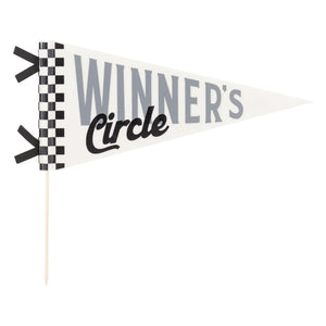 Wave this Winner's Circle Felt Pennant Flag when your little one crosses the finish line!This striking pennant features a gray and black "Winner's Circle" headline on a white felt flag with a black and white checkered flag edge. Slip it on the included wooden dowel for easy display. Whether you're using it as a cake topper or gifting it as a party favor to the birthday champ, this racing party decoration calls for a victory lamp. Perfect for celebrating a fast one birthday, a two-fast birthday, or any racing party where victory is on the horizon, hang this pennant proudly as a centerpiece or grab it for fun photo booth props.