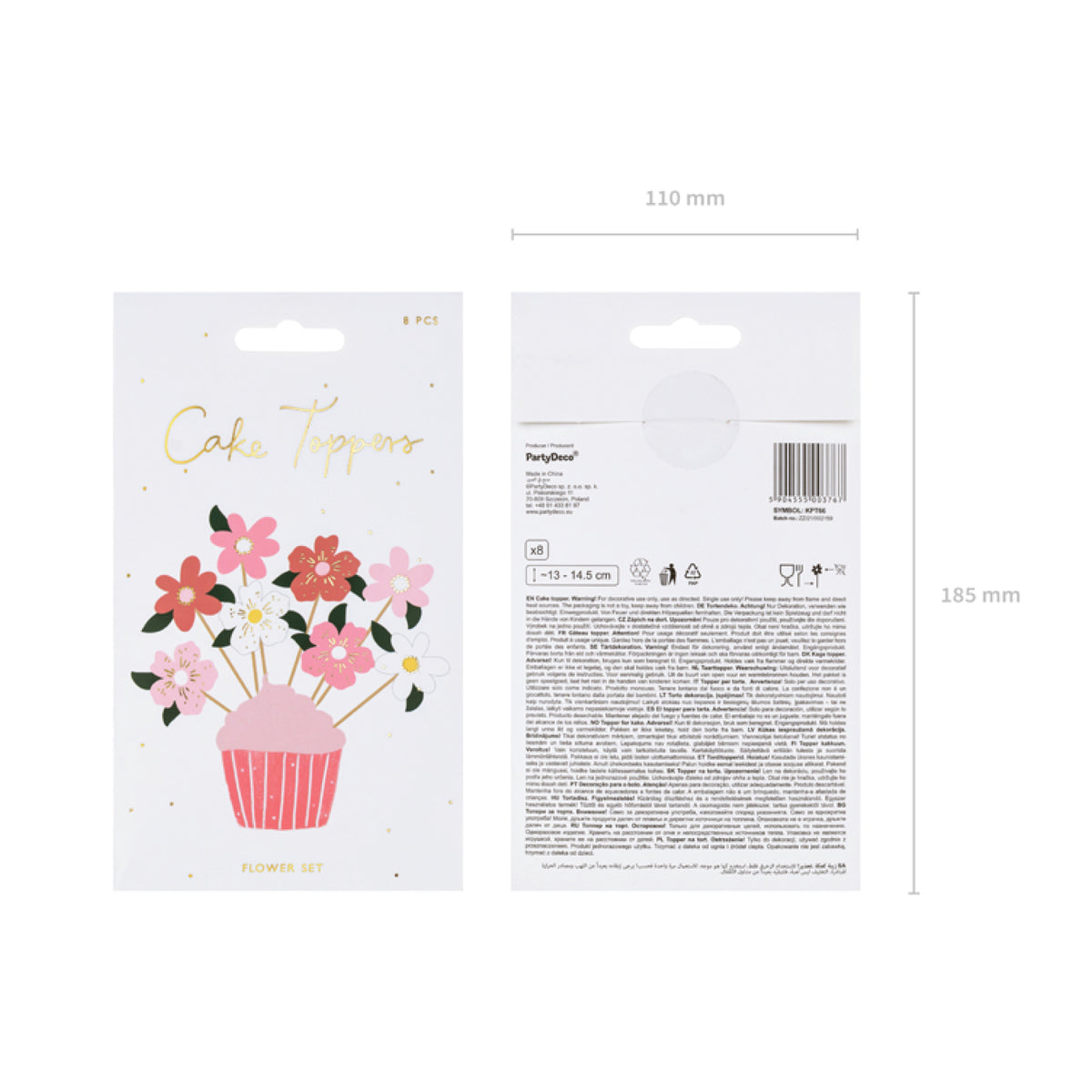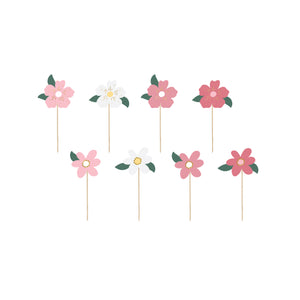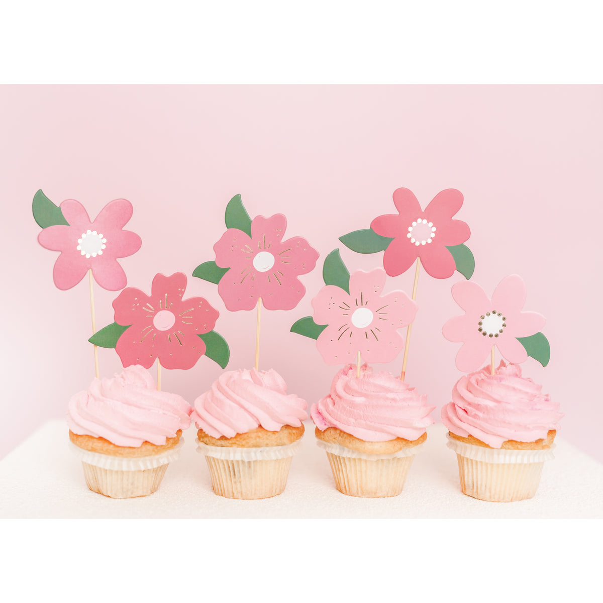 Top off your tea party treats with these Pink Flower Cupcake Toppers. These cake decorations feature a bouquet of pretty flowers in blush pink, dark pink, light pink, and white with gold foil details attached to wooden sticks. Use these cupcake toppers at your flower power birthday, floral bridal shower, tea party baby shower, or spring garden party.
