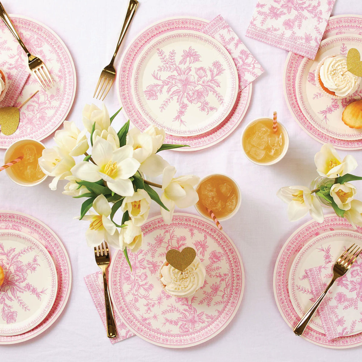 Accentuate the sweetness of your gatherings with Pink Toile Dessert Plates. These small paper plates are adorned with a light pink floral toile pattern, creating a sophisticated and dainty tabletop. Their petite yet stylish design makes them a seamless addition to baby showers, tea parties, bridal showers, or any event where a touch of pink is desired. Ideal for serving sweet treats, pastries, or hors d'oeuvres, these plates effortlessly complement pink-themed events while simplifying post-party cleanup.