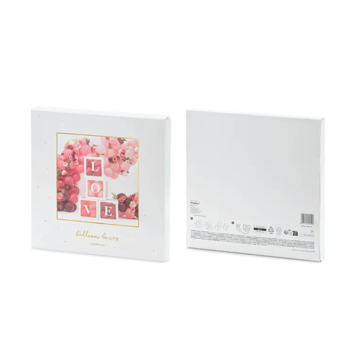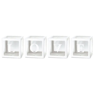 Create a focal point at your wedding shower with these cute White Pop-Up Love Block Decorations. The white boxes with acetate windows spell out the word LOVE. Use it as a centerpiece or a photo backdrop for your baby shower. Simple assembly is required. Just unfold the boxes and assemble them together. Add the L-O-V-E stickers to the front windows. Blow up balloons with air (no helium is needed). Place the balloons into the blocks and arrange to spell out LOVE. Add some greenery or other colored balloons to create a custom look.