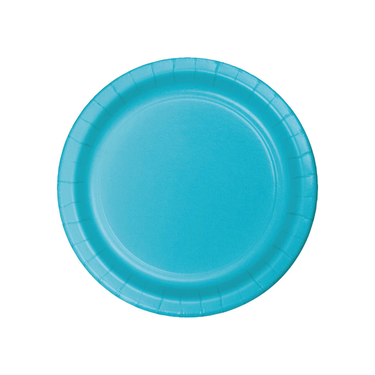 Everyone can enjoy a slice of cake at your party using these Bermuda Blue Paper Dessert Plates. These small paper plates feature a raised rim and heavy-duty construction to hold all sorts of small snacks and desserts. Their solid bright blue color is perfect for coordinating your blue baby shower or your little one's first birthday party theme. So set a stack of these blue paper plates on the dessert table at birthdays, baby showers, and more!