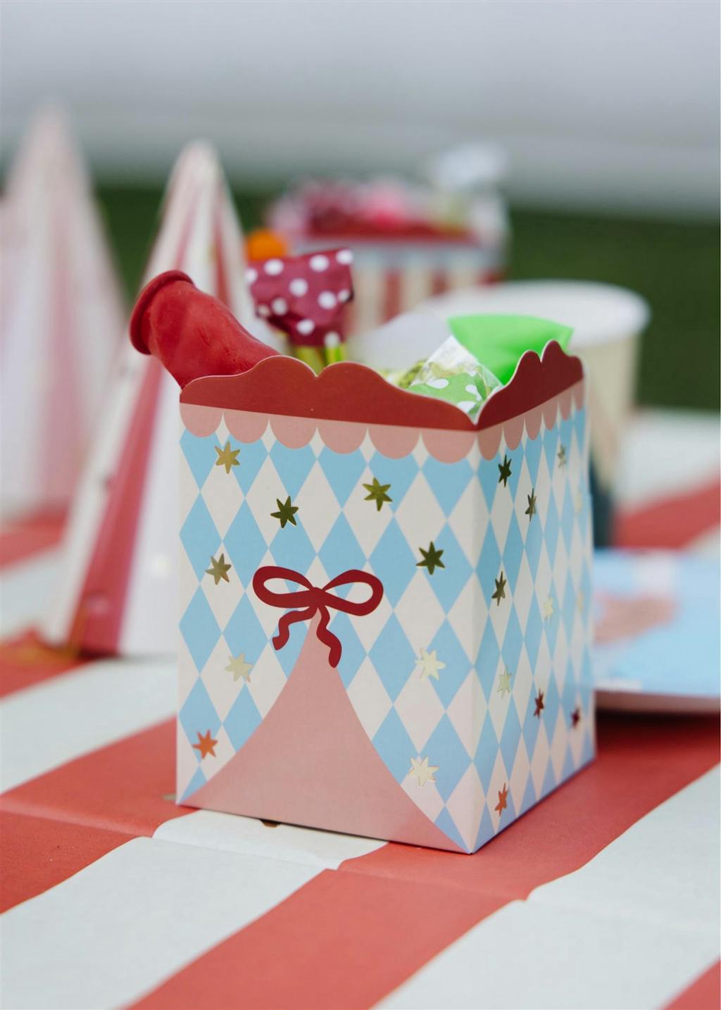 Bring the magic of the big top to your party with our Circus Snack Boxes! This charming set comes in three playful vintage designs, each adding a festive touch to your celebration. One box features bold red and cream stripes with shimmering gold foil stars and a blue bow design, creating the look of circus curtains about to open for the main event. Another boasts a blue and cream diamond pattern, with the same curtain illusion. The third design pops with cream and red triangles on a blue background, accented with more dazzling gold foil stars. Perfect for popcorn, candy, or party favors, these snack boxes add festive flair and fun to any circus-themed celebration!