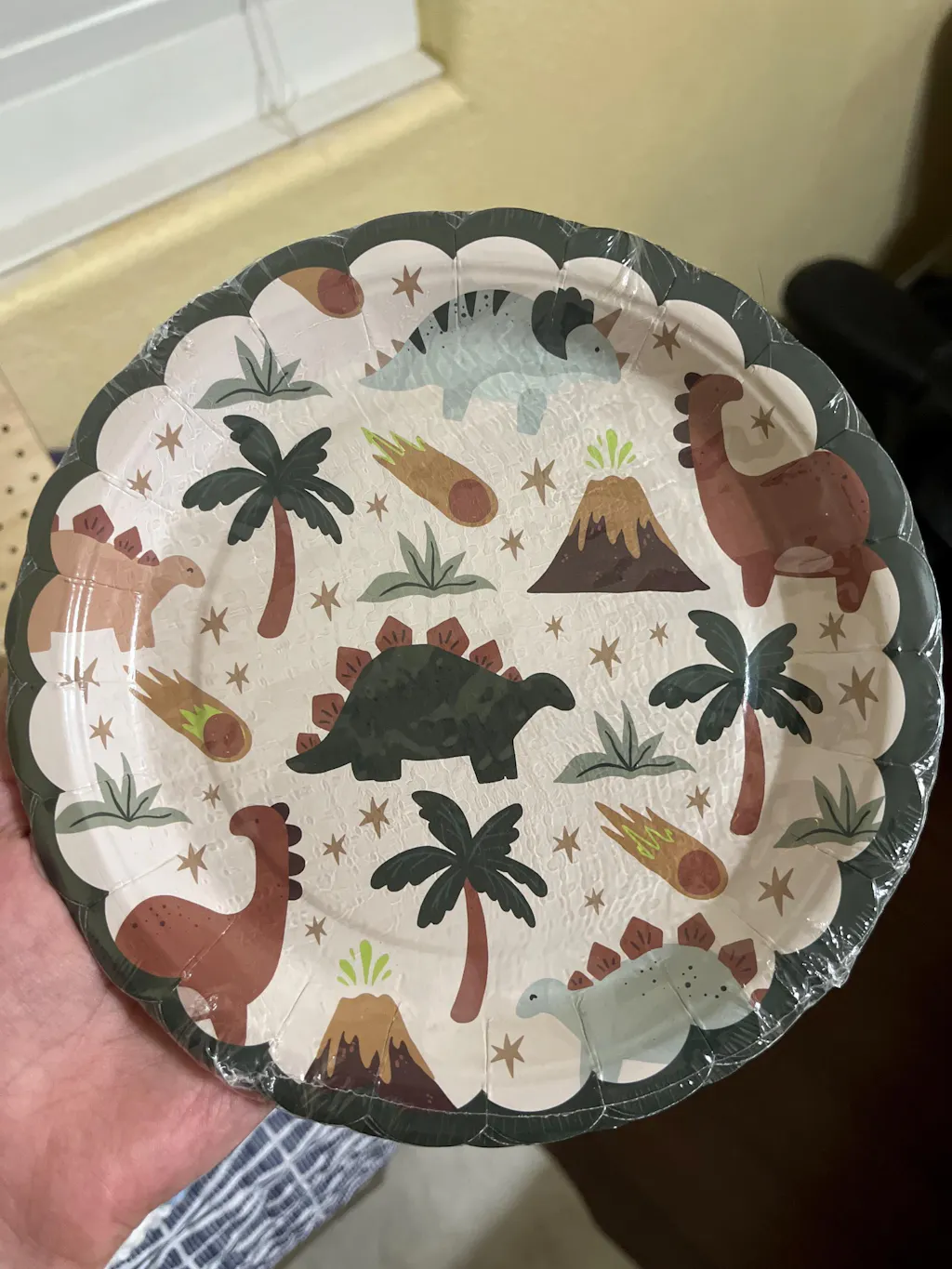 Add some roar to your dinosaur party with Dinosaur Dessert Plates! These paper plates feature a whole Jurassic world of illustrations, including dinosaurs, volcanos, palm trees, stars, and meteors on a light background with a green scalloped edge. Perfect for serving sweet treats and snacks, these dino plates will make your little ones (and not-so-little ones) "dig" in with excitement! Make your guests feel like they're in the Jurassic era (but without the danger), and use these dinosaur plates at a dino birthday party or any dino-mite celebration!