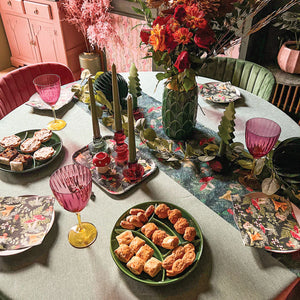Bring the mystical allure of the woods to your table with this Midnight Forest Fabric Table Runner. This reusable runner features a botanical mushroom design set against a rich, deep forest green background. Whether hosting a woodland baby shower or an enchanted forest birthday party, this table runner transforms any event into a woodland wonderland. Lay this mushroom table runner down the center of your table to instantly infuse the space with woodland charm, creating a beautiful focal point that sets the stage for a truly mystical and unforgettable gathering.